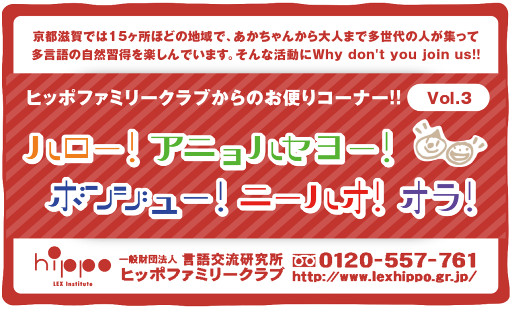 ヒッポファミリークラブ伏見の石川です。ヒッポファミリークラブは、たくさんのことばを自然に習得しようという活動をしています。 先日、中1の次男と話していた時のこ... -