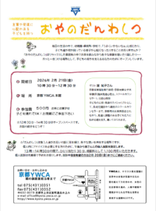 | イベントURL | https://kyoto.ywca.or.jp/event/%e8%a8%80%e8%91%89%e3%82%84%e7%99%ba%e9%81%94%e3%81%ab%e5%bf%83%e9%85%8d%e3%81%ae%e3%81%82%e3%82%8b%e5%ad%90%e3%81%a9%e3%82%82%e3%82%92%e6%8c%81%e3%81%a4%e3%80%8c%e3%81%8a%e3%82%84%e3%81%ae%e3%81%a0-2/ |